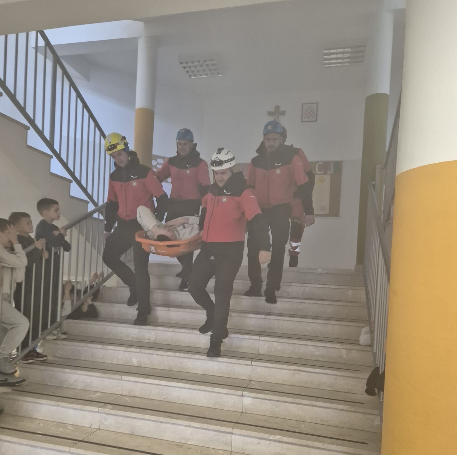 U prvom dijelu edukacije izvedena je vježba evakuacije i spašavanja učenika i zaposlenika škole. Simuliran je nastanak požara u školi, pri čemu je domar pokušavao ugasiti požar, ali nakon neuspjelog pokušaja gašenja požara pozvao je vatrogasce i zadužio drugog domara da širom otvori sva izlazna vrata iz škole, te aktivira školsko zvono. Aktiviranjem školskog zvona uslijedila je evakuacija iz škole. Pri dolasku na evakuacijsko mjesto (prostor ispred škole), nastavno osoblje je kontroliralo broj učenika iz svog razreda. Pripadnici gorske službe spašavanja provjerili su jeli netko ostao u učionicama, te su ozlijeđene učenike izveli na sigurno. Volonteri Crvenog križa pružili su pomoć ozlijeđenima. Djelatnici Doma zdravlja su prevezli ozlijeđene na daljnje postupanje. Za vrijeme požara, evakuacije i spašavanja policija je osiguravala mjesto evakuacije.